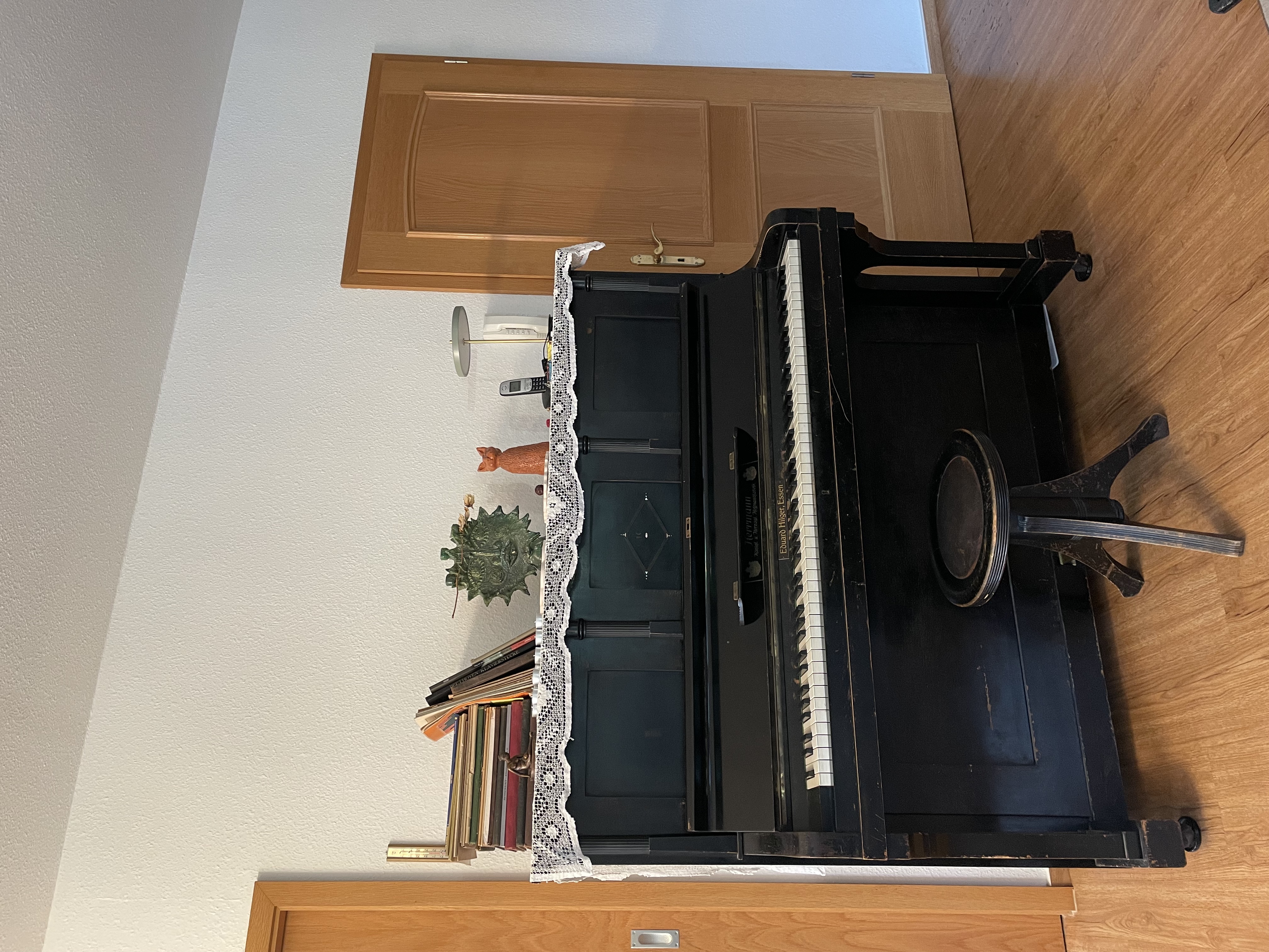 Wohn- und Essbereich mit Klavier, eine voll ausgestattete Küche